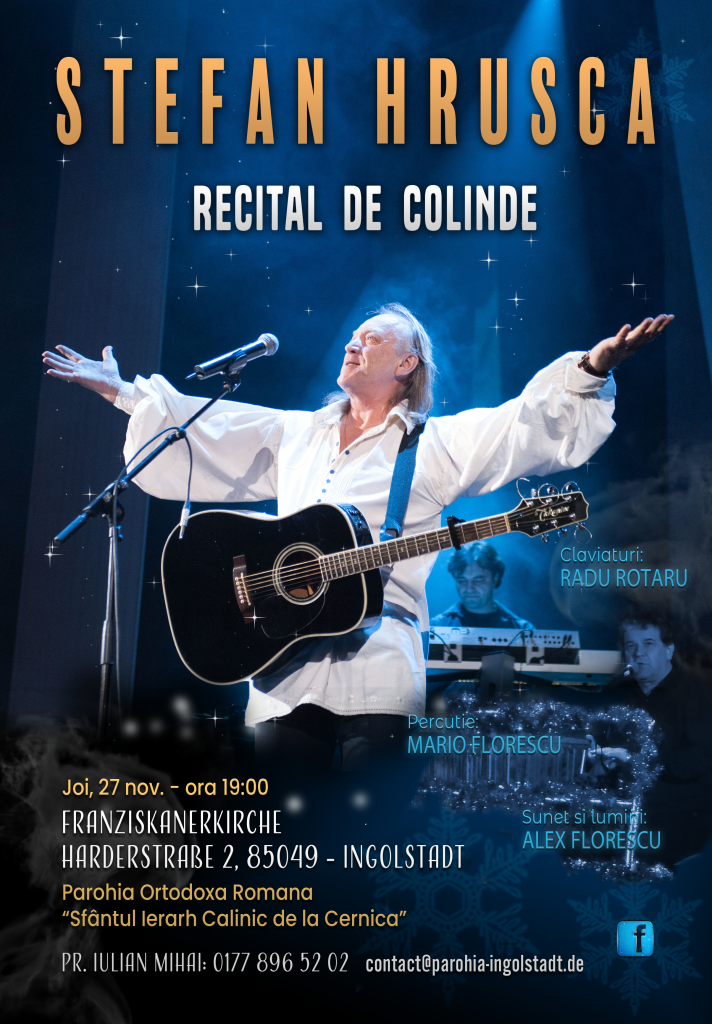 Joi 27 noiembrie 2025 începând cu ora 19:00, cunoscutul interpret Ștefan hrușcă va susține un concert de colinde în Biserica franciscană din Ingolstadt. Adresa bisericii este următoarea: Harderstraße 2, 85049 Ingolstadt
